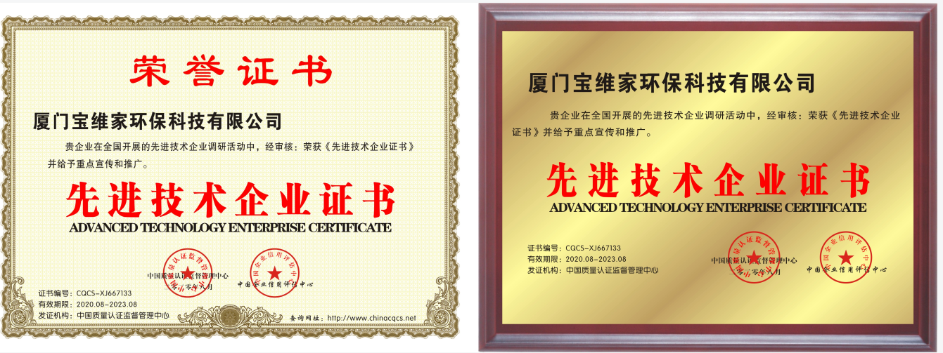 廈門寶維家環(huán)保科技有限公司在全國開展的先進激素企業(yè)調(diào)研活動中,經(jīng)審核:榮獲《先進技術(shù)企業(yè)證書》并給予重點宣傳和推廣。