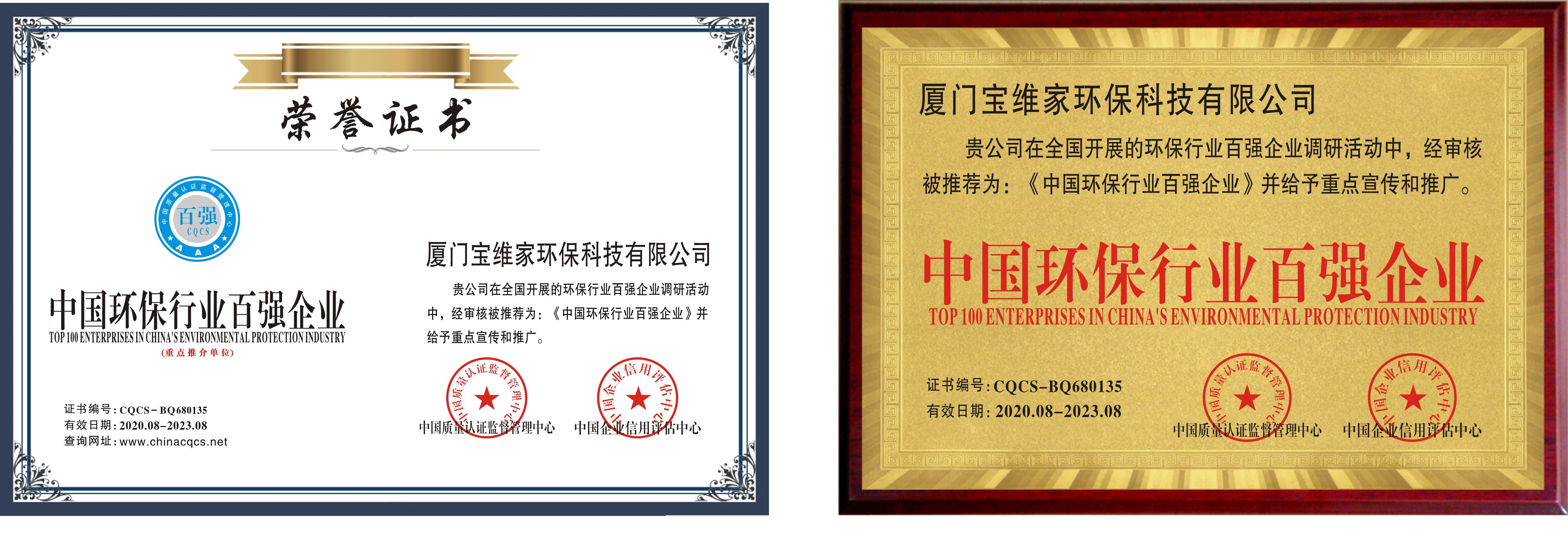 (“中國環(huán)保行業(yè)百強企業(yè)”榮譽證書)
