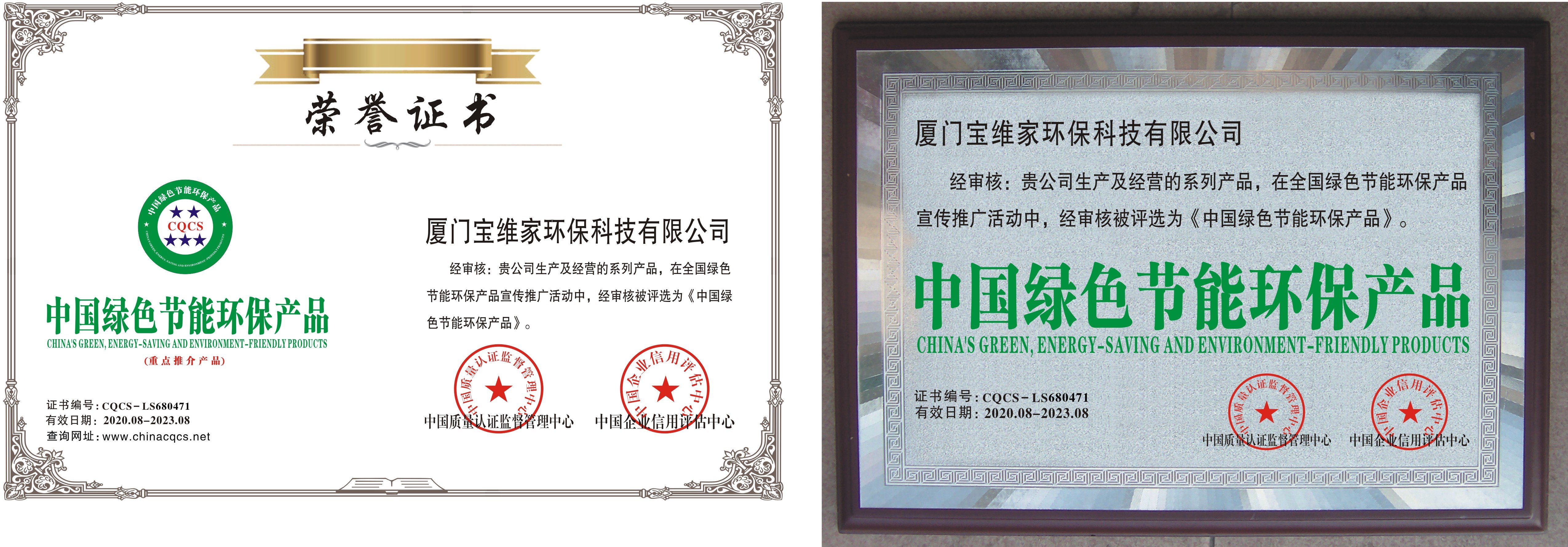 (“中國綠色節(jié)能環(huán)保產(chǎn)品”榮譽證書)