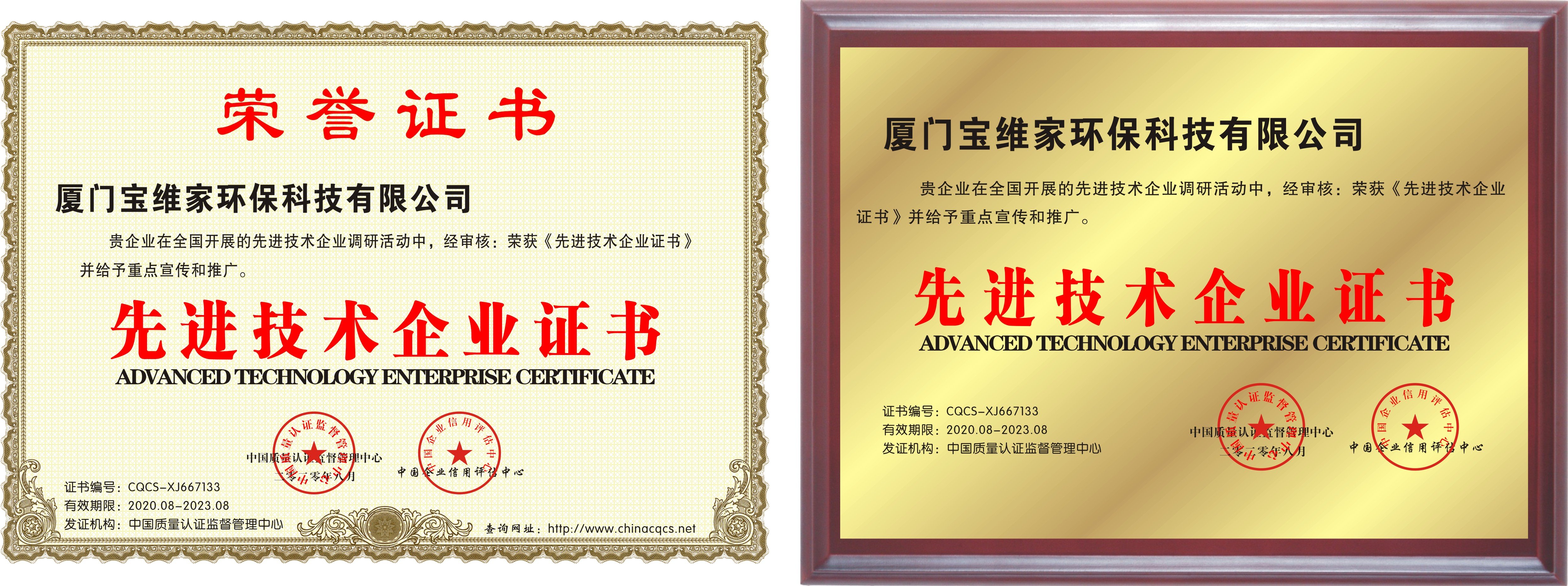 廈門寶維家環(huán)??萍加邢薰驹谌珖_展的先進激素企業(yè)調(diào)研活動中,經(jīng)審核:榮獲《先進技術(shù)企業(yè)證書》并給予重點宣傳和推廣。