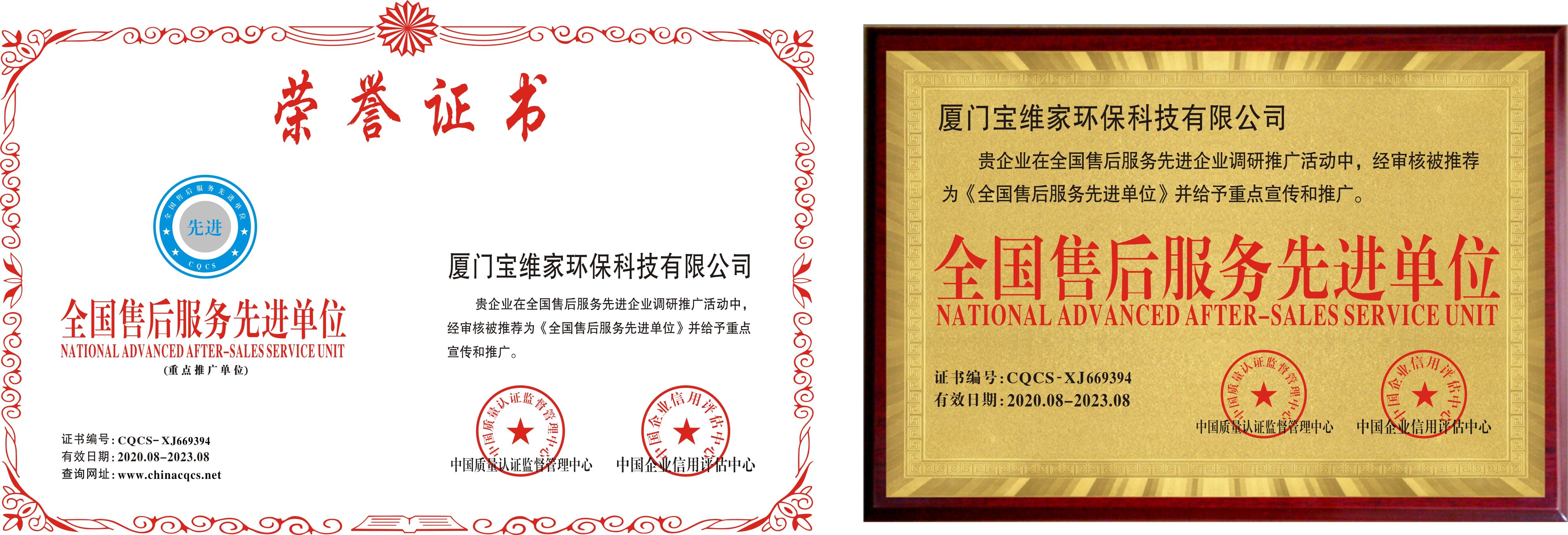 廈門寶維家環(huán)保科技有限公司在全國售后服務(wù)先進企業(yè)調(diào)研推廣活動中,經(jīng)審核被推薦為《全國售后服務(wù)先進單位》并給予重點宣傳和推廣。
