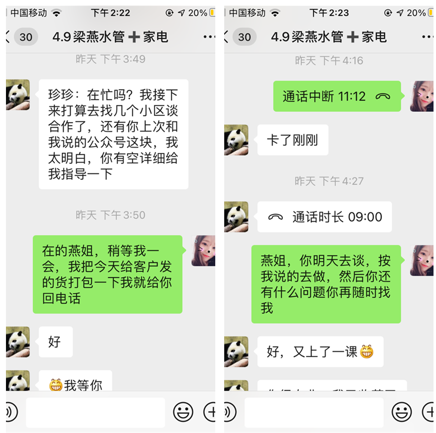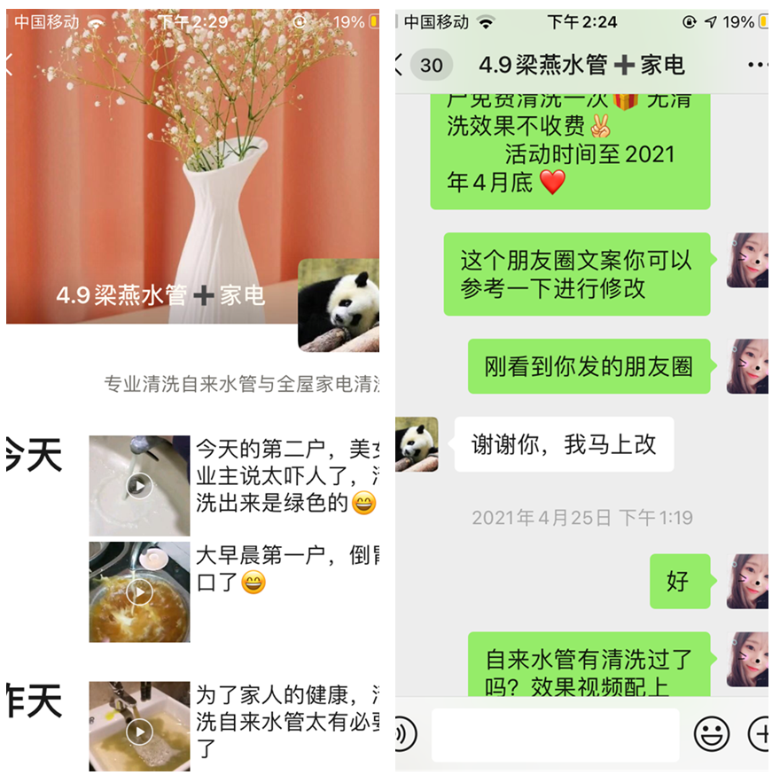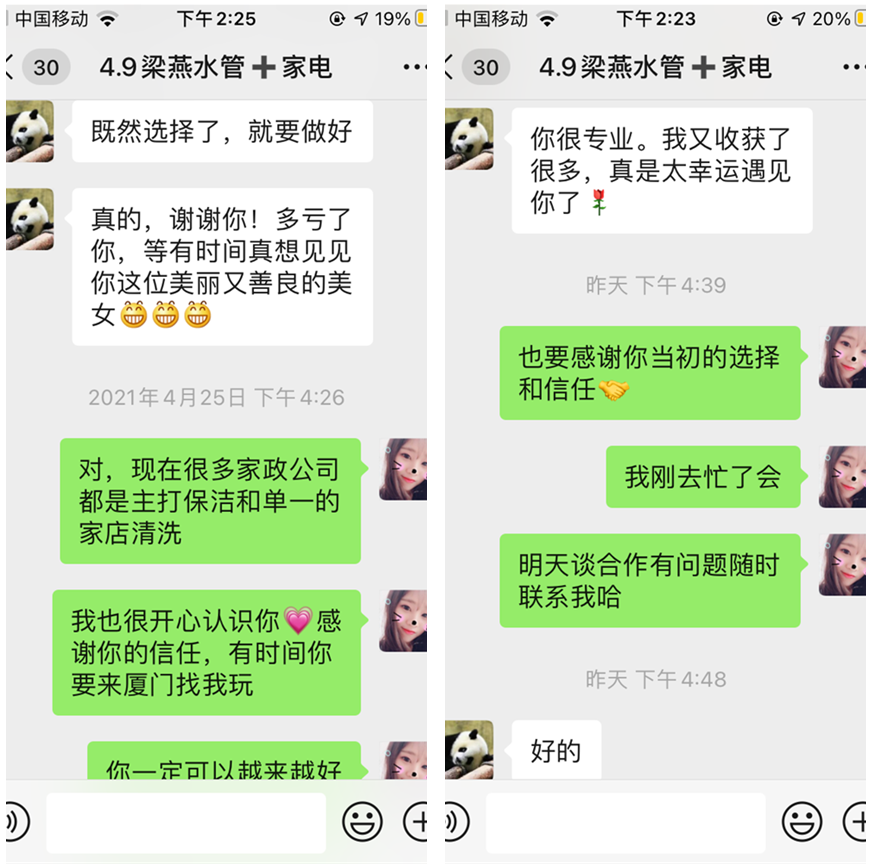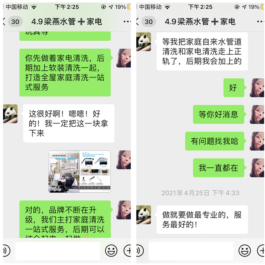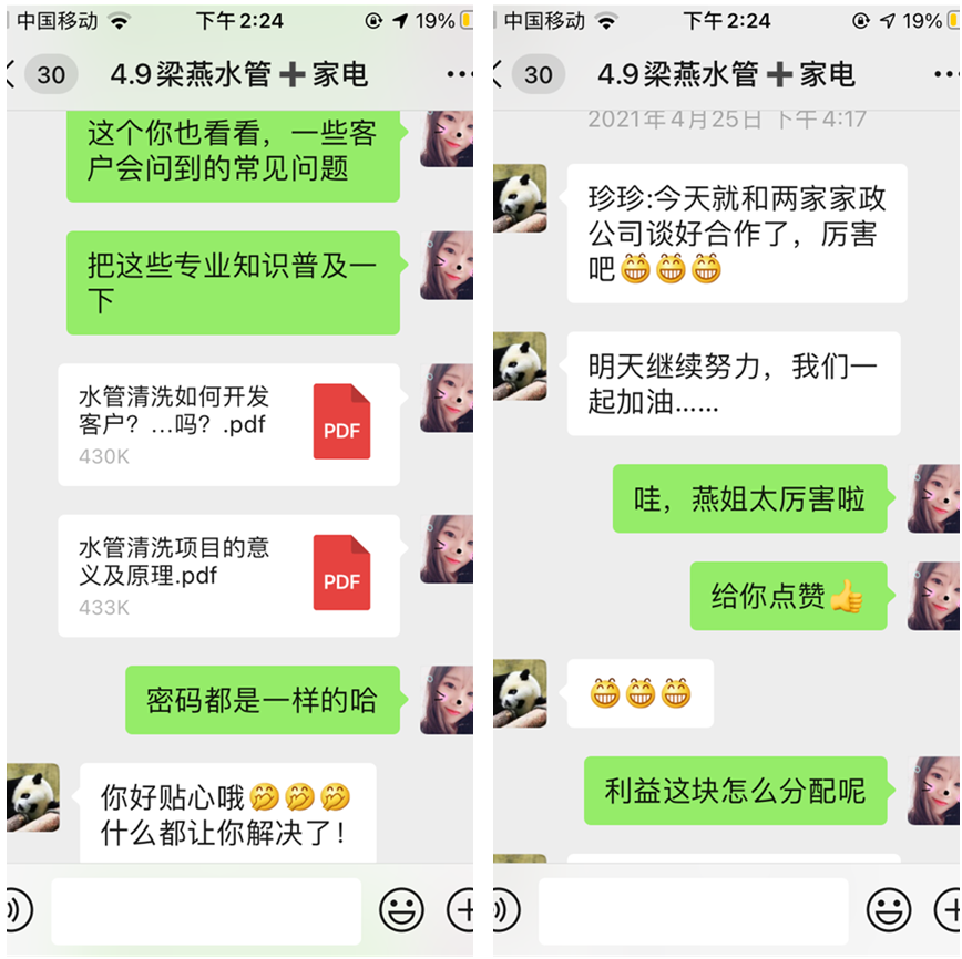 在收到設備之后,燕姐就馬上清洗了自家的水管與家電。在熟悉了基本的話術(shù)、專業(yè)知識和設備的操作之后,我們的業(yè)務員就開始指導燕姐去著手談渠道合作,燕姐執(zhí)行力強,立馬就去執(zhí)行,結(jié)果簽下了兩家與家政公司的合作。