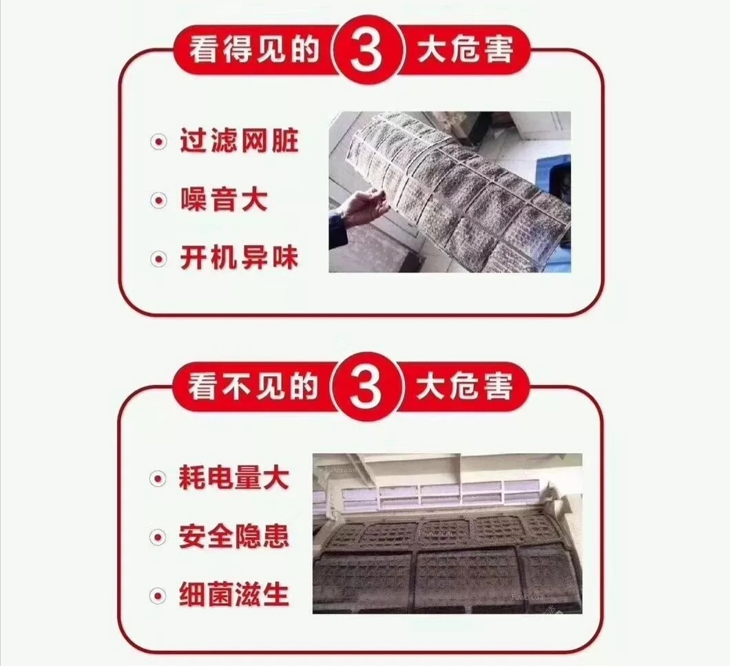例如空調(diào)清洗:我們使用空調(diào)的時(shí)候,空調(diào)就像一個(gè)大型吸塵器,會(huì)把空氣中的灰塵吸進(jìn)空調(diào)里面,一段時(shí)間后,空調(diào)散熱片、過(guò)濾網(wǎng)、排風(fēng)板等部位會(huì)堆積大量的灰塵,滋生病菌,制冷效果差,耗能增加等危害??照{(diào)開(kāi)機(jī)后,內(nèi)部的病菌會(huì)隨著冷氣吹出,引發(fā)呼吸道疾病等空調(diào)病。室外空調(diào)機(jī)長(zhǎng)期風(fēng)吹日曬,灰塵會(huì)堆積的更厲害。所以每隔一段時(shí)間,要給空調(diào)洗洗澡。