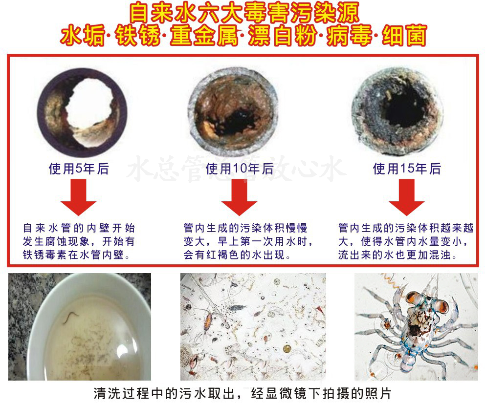 4.從抽水或供水開始,經(jīng)過老化的管道,骯臟的水塔,水中的沉淀物終全部流到家里的水管內(nèi),長時(shí)間的浸泡,沉淀物就容易積附在管內(nèi)壁.
