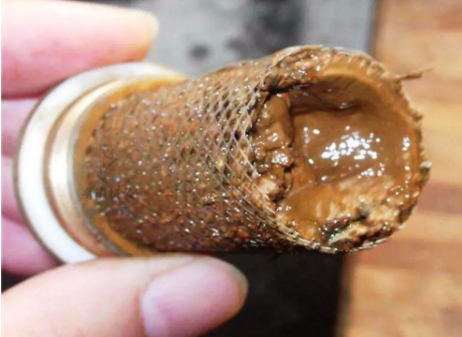 用活口扳子,可以打開這個接頭的頂端。把頂部取出來,就能看到連接著的濾網(wǎng)。用水沖洗濾網(wǎng),就完成了地暖濾網(wǎng)的基本清洗。我們可以在每年供暖前半個月到一個月的時間里清洗濾網(wǎng),觀察濾網(wǎng)的狀態(tài)。如果濾網(wǎng)上面只是有輕微泥沙,簡單清洗濾網(wǎng)后就可以了。如果濾網(wǎng)一斤被泥沙堵死了,比如下圖中這樣▼